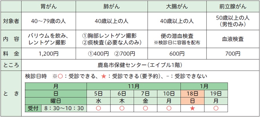 がんセット検診では、胃がん・肺がん・大腸がん・前立腺がんの最大4種類のがん検診を同日に受けることができます。1種類からでも受診できます。ネットまたは電話にてお申し込みされた人には受診票を発行します。