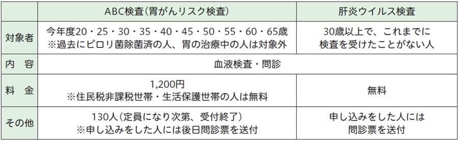 ピロリ菌検査、ペプシノーゲン検査を組み合わせて胃の健康度を判定するABC検査と肝炎ウイルス検査を行います。