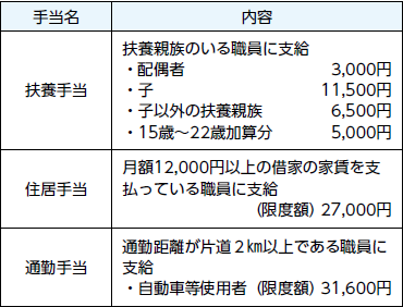 (注)上記手当のほか、管理職手当、管理職員特別勤務手当、休日勤務手当があります。