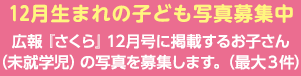 メールの件名を「すくすくおぎっこ12月号申込み」とし、お子さんの写真(3MB以内)と、(1)お子さんの氏名(ふりがな)(2)生年月日(3)申込者の氏名、住所、電話番号(4)お子さんへのメッセージ(30文字以内)を記載し、下記のアドレスへ送付してください。