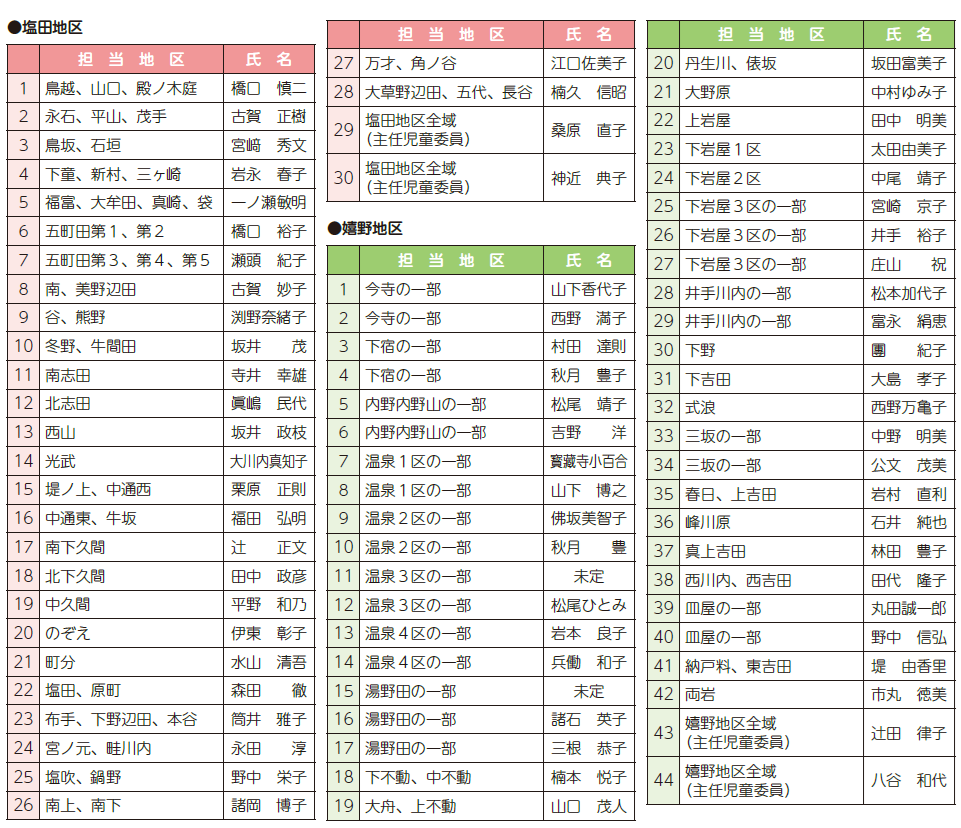 地域のボランティアとして、地域福祉や児童福祉について「相談」や「支援」を行っている身近な相談相手です。任期は令和10年11月30日までの3年間です。高齢者・障がい者・児童・生活・子育てなどについて、悩みごとや心配ごとがありましたら担当地区の委員にお気軽にご相談ください。個人の秘密は固く守ります。ご不明な点は、上記までお問い合わせください。