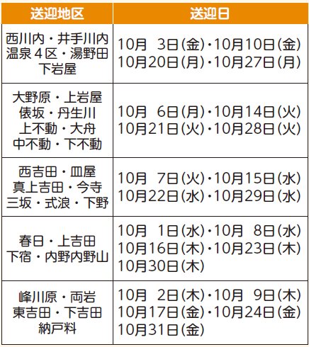 くらし 令和7年10月 嬉野老人福祉センター送迎表 42/46 前の記事 次の記事 発行日 : 2025年10月01日 自治体名 : 佐賀県嬉野市 広報紙名 : 市報うれしの 2025年10月号 【利用について】 対象者:60歳以上の市内在住者 利用料:1人1日 150円 利用時間:9:00~15:30 ※入浴は9:30~15:30 休館日:日曜日・祝日、第2・4土曜日、8/13~15、12/27~1/4 ※避難所となった場合など、臨時休館となることがあります。 連絡先:嬉野老人福祉センター 【電話】0954-42-2020 Tweet シェアする うれしのまるく通信 商工会青年部通信