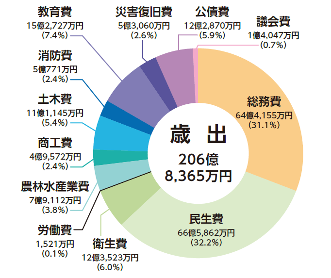 歳出決算額は前年度比で4.7%増加しました。総務費(新庁舎整備関連事業)、教育費(学校施設バリアフリー化・長寿命化、国スポ・全障スポ)、災害復旧費(令和3年8月豪雨災害復旧)などが増加した主な要因となっています。一方、衛生費(新型コロナウイルスワクチン接種対策負担金事業)、農林水産業費(強い農業づくり総合支援事業)、商工費(新型コロナウイルス感染症緊急対策事業)、土木費(市道舗装長寿命化事業、市道本通り線舗装補修事業)は減少しました。