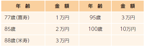 くらし 長寿祝金 10/41 前の記事 次の記事 発行日 : 2025年09月01日 自治体名 : 佐賀県吉野ヶ里町 広報紙名 : 広報よしのがり 2025年9月号 下記の対象者へ、年齢の節目に長寿祝金を支給します。 対象:(1)(2)のいずれにも該当する人 (1)吉野ヶ里町に住民登録をして1年以上居住している人(基準日9月1日) (2)令和7年度(R7.4.1~R8.3.31)に年齢が77・85・88・95・100歳になる人 支給方法:9月中に地区民生委員が訪問等行います。 祝金の額: 問い合わせ:福祉課福祉係(東脊振庁舎) 【電話】0952-37-0343 Tweet シェアする 吉野ヶ里町敬老会 はり・きゅう等施術券