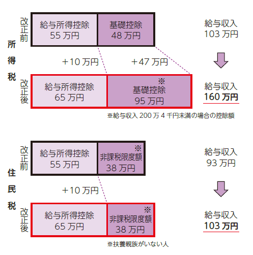 ・所得税と住民税の給与所得控除の最低保障額が55万円から65万円に引き上げられました。