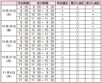 10月23日(木)と24日(金)、25日(土)、27日(月)、11月6日(木)に保健センターにて総合健診(特定健診・各種がん検診)を行います。