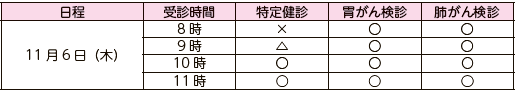 健診日程と予約状況は別表のとおりです。まだ今年度の健(検)診の予約をされていない方は、空いている時間をご案内できますので、保健センターまでご連絡ください。