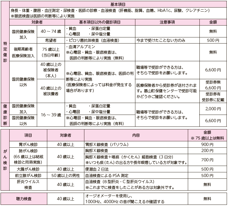 表1.総合健診対象者・内容・金額 *対象年齢は令和8年3月31日時点(令和7年度末の到達年齢)です。