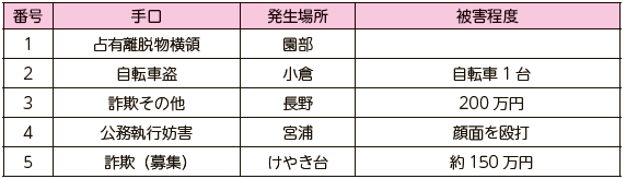 番号2:駐輪場にて自転車が盗まれたもの。自転車は無施錠。その後他県で発見。