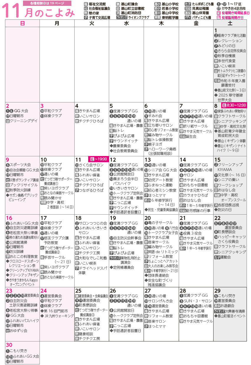 くらし 11月のこよみ 34/47 前の記事 次の記事 発行日 : 2025年11月01日 自治体名 : 佐賀県基山町 広報紙名 : 広報きやま 2025年11月号 Tweet シェアする まちの話題 町営住宅の空室状況