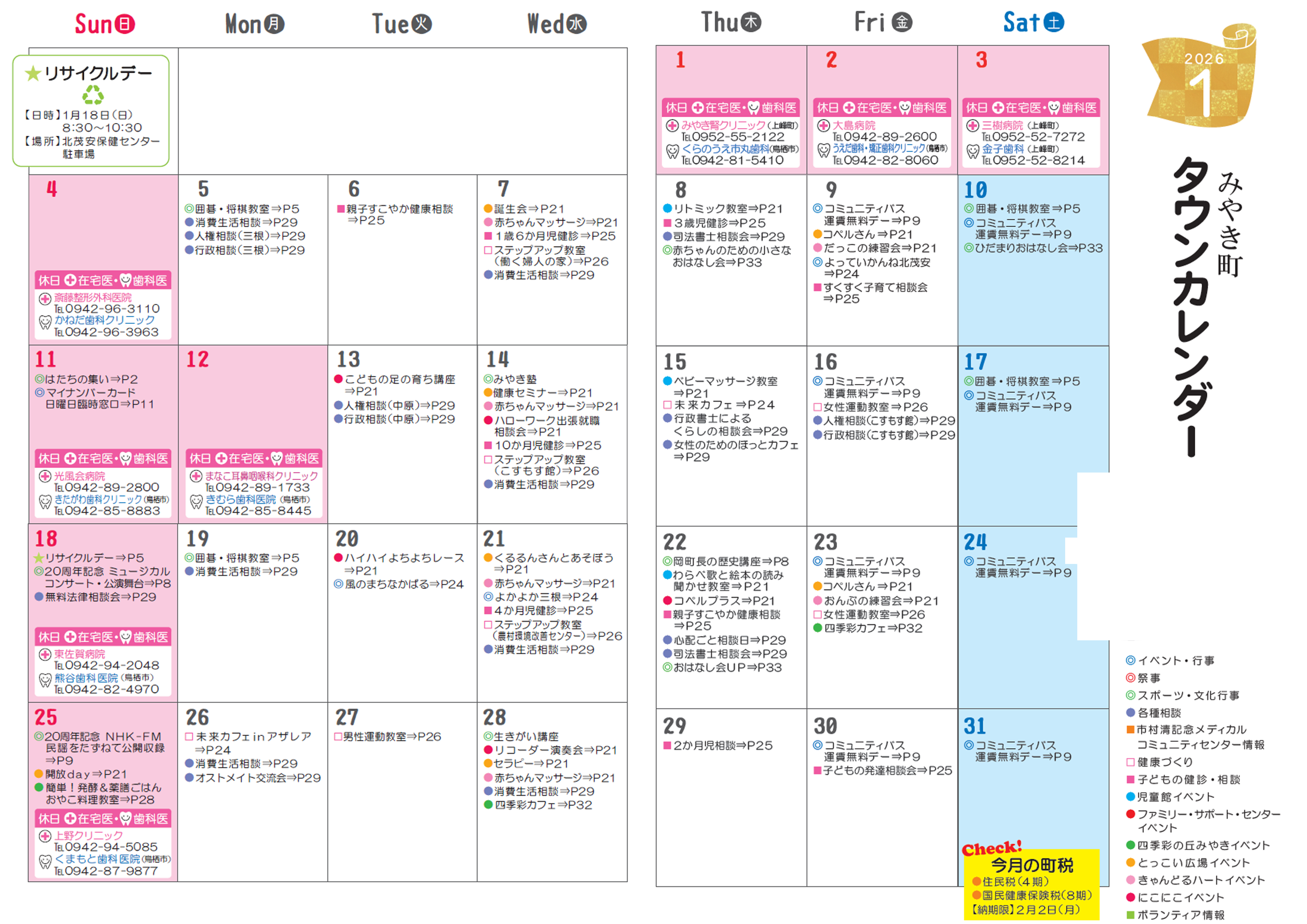 くらし 2026.1 みやき町タウンカレンダー 4/59 前の記事 次の記事 発行日 : 2026年01月01日 自治体名 : 佐賀県みやき町 広報紙名 : 広報みやき 2026年1月号 ※時間外(17:00以降)緊急医療機関 問い合わせ:鳥栖・三養基消防署 【電話】0942-83-0063 ※休日在宅医・歯科医は、病院の都合により変更になる場合があります。 Tweet シェアする 【町政かわら版(HotNews!)】 囲碁・将棋教室(参加者募集!)