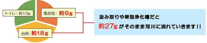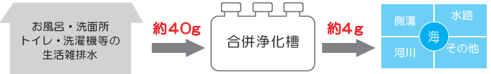 合併浄化槽は汚れのもとになるものを、約40gを約4gにまで減少できます。