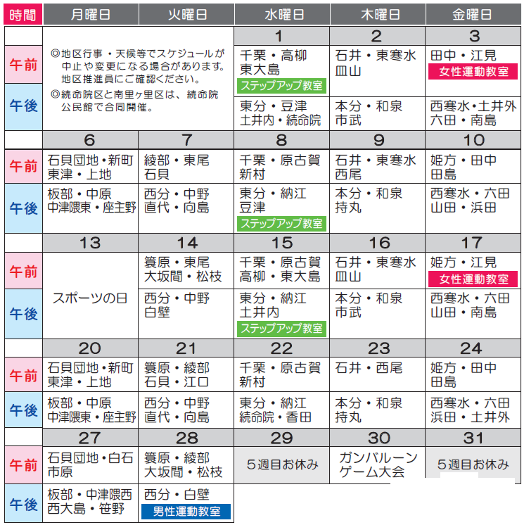 ・ステップアップ教室・男性・女性運動教室は、地区健康教室よりも少しきつめのプログラムとなっています。