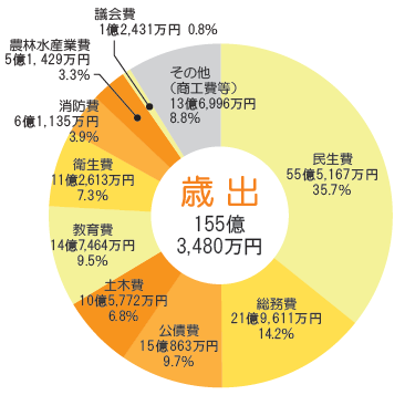 歳出額は155億3,480万円で、前年度と比べ4億1,543万円の増となりました。