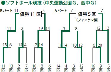 後期は5競技。屋外種目を中心に、秋空の下で「スポーツの秋」を満喫する各区の精鋭約670人のスポーツマン・ウーマンが老若男女を問わず、得意のスポーツを競いました。各区の役員や応援者が各会場を渡り歩き、最高気温23℃の絶好のスポーツ日和に、選手は心地よい汗を流しました。