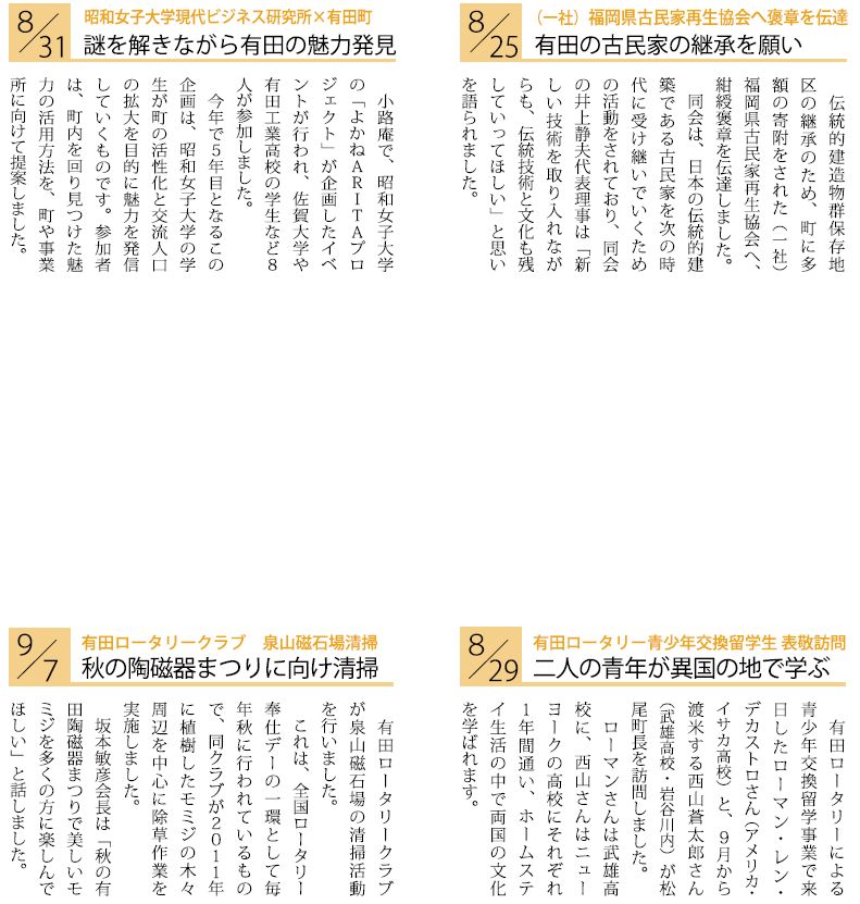 くらし まちの話題 3/39 前の記事 次の記事 発行日 : 2025年10月01日 自治体名 : 佐賀県有田町 広報紙名 : 広報有田 2025年10月号 Tweet シェアする 今月のPICK UP NEWS!! 有田夏祭り納涼花火大会