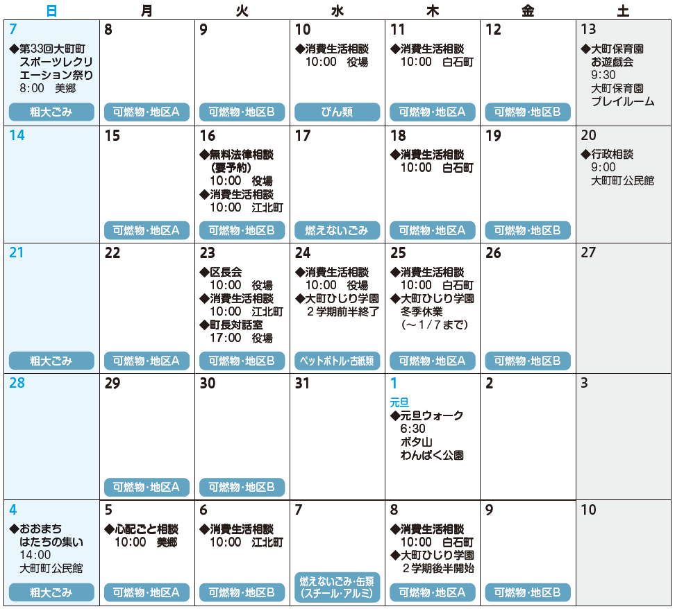 収集日については、お配りした「令和8年大町町ごみ収集カレンダー」でご確認ください。