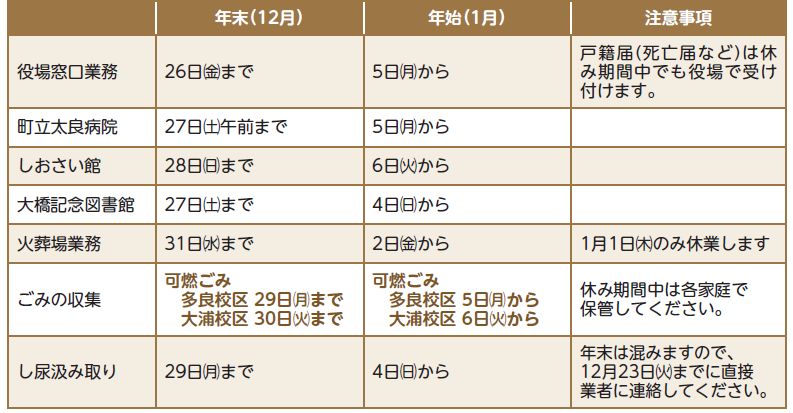 くらし 年末年始の役場等の業務 1/42 次の記事 発行日 : 2025年12月01日 自治体名 : 佐賀県太良町 広報紙名 : 町報たら 令和7年12月号 ■太良クリーンセンターへのゴミの持込み可能時間 Tweet シェアする ☆守ろう交通ルール 高めよう交通マナー☆ 冬の交通安全県民運動