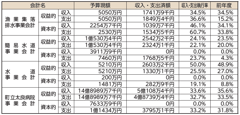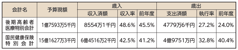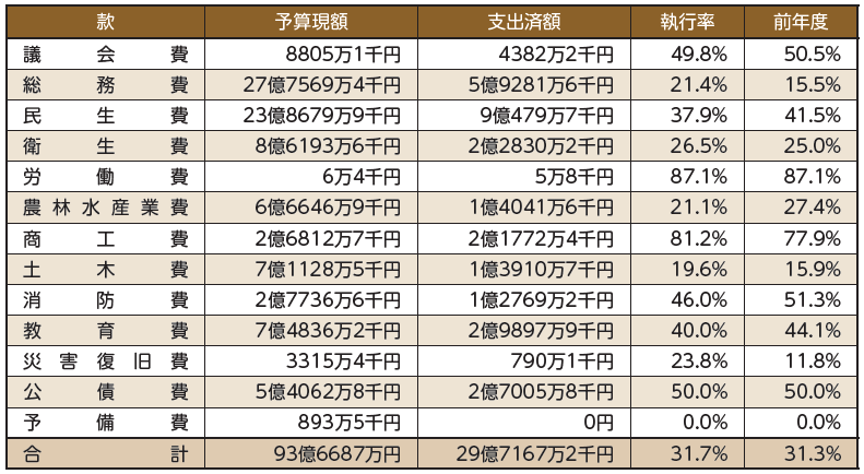 上半期の予算執行状況を見てみると、収入済額は33億2717万6千円で予算現額の35.5%(前年度35.0%)の収入率、支出済額は29億7167万2千円で予算現額の31.7%(前年度31.3%)の執行率となっています。