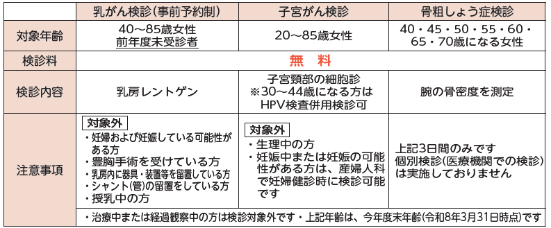 次のとおり、女性を対象としたレディース検診(乳がん検診・子宮がん検診・骨粗しょう症検診)を行います。