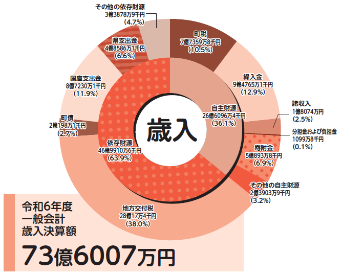 寄附金(1億2058万3千円の減)、町税(2051万6千円の減)、町債(7459万5千円の減)等が減少する一方、繰入金(9658万9千円の増)、県支出金(6674万4千円の増)、地方交付税(6194万8千円の増)等が増加しています。