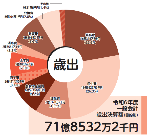 令和6年度一般会計の決算額は、歳入が73億6007万円で、前年度と比較すると1億257万9千円(1.4%)の増、歳出は71億8532万2千円で、1億3256万2千円(1.9%)の増となり、令和5年度決算を上回りました。
