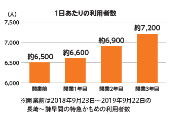 開業3年目の1日あたりの利用者数は延べ7,000人を超え、開業当時から年を追うごとに増加しています。開業後3年間の利用者数は約758万人にのぼり、多くの方が新幹線を利用しています。また、日常的な利用も進んでいて、開業当初より約3倍となる692名の方が通勤・通学に定期券を利用しています(令和7年8月末時点)。