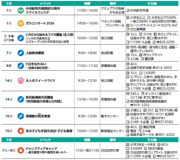 イベント イベントカレンダー 34/40 前の記事 次の記事 発行日 : 2026年01月01日 自治体名 : 長崎県長崎市 広報紙名 : 広報ながさき 令和8年1月号 No.900 詳細は市・各施設のウェブサイトかあじさいコール(【電話】822-8888)へ 健康・福祉、子育てに関するイベントは「暮らしのお知らせ(20〜22ページ)」をご覧ください。 Tweet シェアする EVENT PICK UP 注目イベントを紹介! 人口の動き