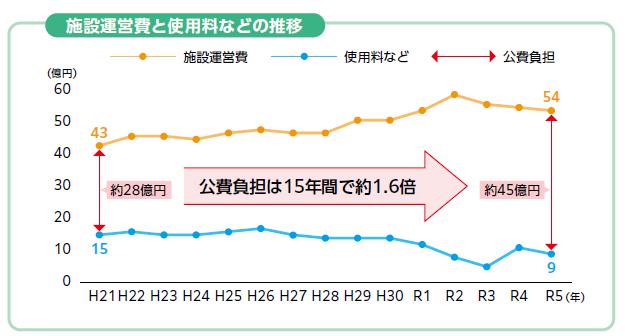 施設の運営費は使用料と公費(施設を使用しない人を含む市民の税金など)で負担していますが、近年の物価高騰や人件費の増加によって施設の運営費も増加しています。約30年間、使用料を見直していないことから、公費の負担割合が大きくなっています。
