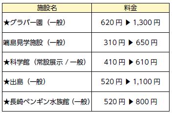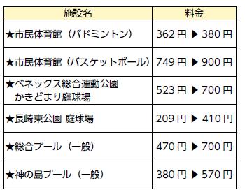 主な使用料・手数料の見直し結果は表のとおりです。「★」が付いている施設の見直し額は、条例で定める「料金の上限額」であり、施設を管理する指定管理者の提案を受けて、最終的な料金を決定します。見直しの結果、原爆資料館やベネックス恐竜博物館など、一般料金が変わらない施設もあります。また、原則こどもの料金は一般料金の半額、未就学児は無料です。