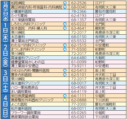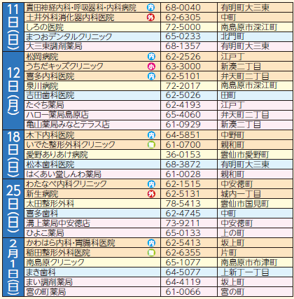 くらし 休日当番の医療機関 39/42 前の記事 次の記事 発行日 : 2026年01月01日 自治体名 : 長崎県島原市 広報紙名 : 広報しまばら 令和8年1月号 市内…9時~18時 市外…9時~17時 歯科…9時~12時 薬局…9時~18時 ※12月15日時点 Tweet シェアする カレンダー2026年1月 とってもお得な商品券販売 !!