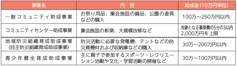 コミュニティ助成事業とは、一般財団法人自治総合センターにより実施される宝くじの社会貢献広報事業として、コミュニティ団体が行う事業に対し助成することで、コミュニティ活動の健全な発展を図る事業です。
