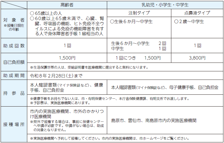 10月1日(水)から、高齢者・乳幼児・小学生・中学生に対する接種費用の一部助成を行います。