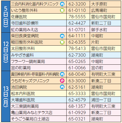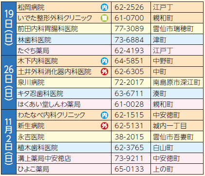 くらし 休日当番の医療機関 ※9月15日時点 42/44 前の記事 次の記事 発行日 : 2025年10月01日 自治体名 : 長崎県島原市 広報紙名 : 広報しまばら 令和7年10月号 市内…9時~18時 市外…9時~17時 歯科…9時~12時 薬局…9時~18時 Tweet シェアする カレンダー2025年10月 令和7年 島原城大手門市