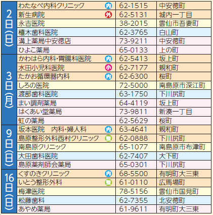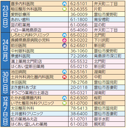 くらし 休日当番の医療機関 ※10月15日時点 36/40 前の記事 次の記事 発行日 : 2025年11月01日 自治体名 : 長崎県島原市 広報紙名 : 広報しまばら 令和7年11月号 市内…9時~18時 市外…9時~17時 歯科…9時~12時 薬局…9時~18時 Tweet シェアする カレンダー2025年11月 第46回島原市民音楽祭