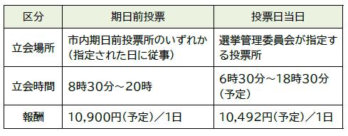 募集内容:募集は登録制で、年間を通じて行います。選挙ごとに、登録者に対して立ち会い可能か確認します。