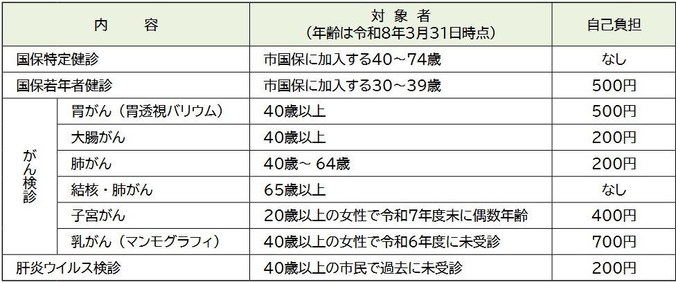 市国民健康保険加入者は、次の健診が利用できます。各医療機関へ予約し、受診ください。