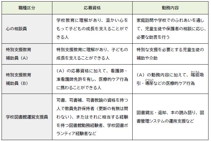 申込方法:学校教育課に備え付けの各職種の申込書(市ホームページからダウンロード可)に必要書類を添えて、申し込みください。