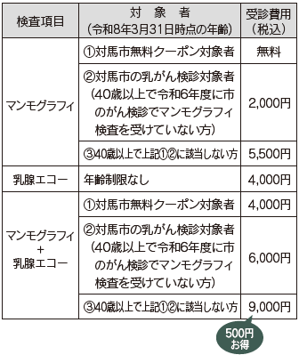 その他:対馬市無料クーポンは4月末に対象者に発送しています。マンモグラフィを昨年度受診された方はご遠慮ください。現在、気になる症状などがある方は、検診を待たずに医療機関を受診してください。来院の際にはマスクを着用し、感染予防に努めていただきますようお願いします。発熱(37.5度以上)などの風邪症状や強い倦怠感がある場合には、受診を見合わせてください。