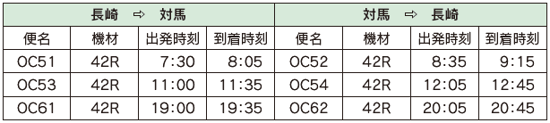 以下のとおり、長崎~対馬線が現在の4往復8便から3往復6便(一部、2往復4便となることもあります。)へ減便となります。詳しくは、ORC(株)ホームページをご覧ください。