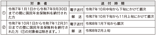日本年金機構から、以下のスケジュールで「社会保険料(国民年金保険料)控除証明書」(以下「控除証明書」という)が対象者宛てに送付されます。お手元に届きましたら、大切に保管し、年末調整や確定申告の際に使用してください。