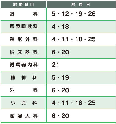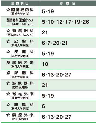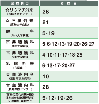 特別診療のうち、長崎大学・国立病院長崎医療センターなど応援につきましては、飛行機の欠航や予定変更により診療を中止・変更することがありますので、事前に確認くださいますようお願いします。