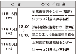 対馬市社会福祉協議会では、法律に関する相談会を開催しています。料金は無料です。