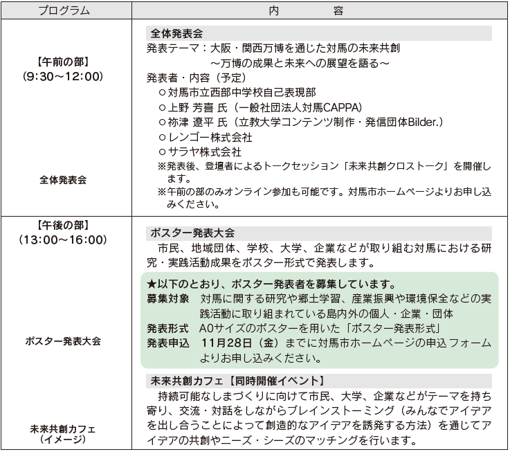 世界最先端のサステナブル・アイランドの実現を目指し、市民、地域団体、学校、大学、企業など、多様な人々が研究や実践活動の成果を発表・共有するイベント「対馬未来フォーラム」を開催します。ポスター発表者はもちろん、観覧のみの参加も可能です。