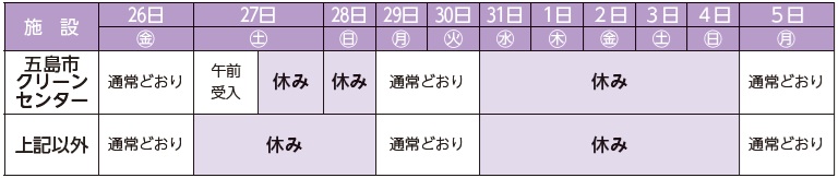 年明けの粗大ごみ収集は、1月12日(月)の収集分から受付けます。施設持ち込みの場合は、年末年始の休業日を除き、通常どおり受入れます。