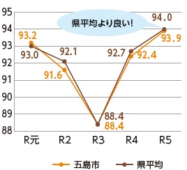 経常収支比率とは、扶助費や人件費など経常的にかかる経費に、市税や各種交付金など経常的に入ってくる一般財源をどのくらい使っているかを表すもので、財政の弾力性や硬直度を見る指標です。