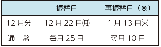 ※振替日に引き落としができなかった場合、翌月に再振替を行います