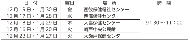 基本的に予約制としていますので、健康ほけん課までご連絡ください。