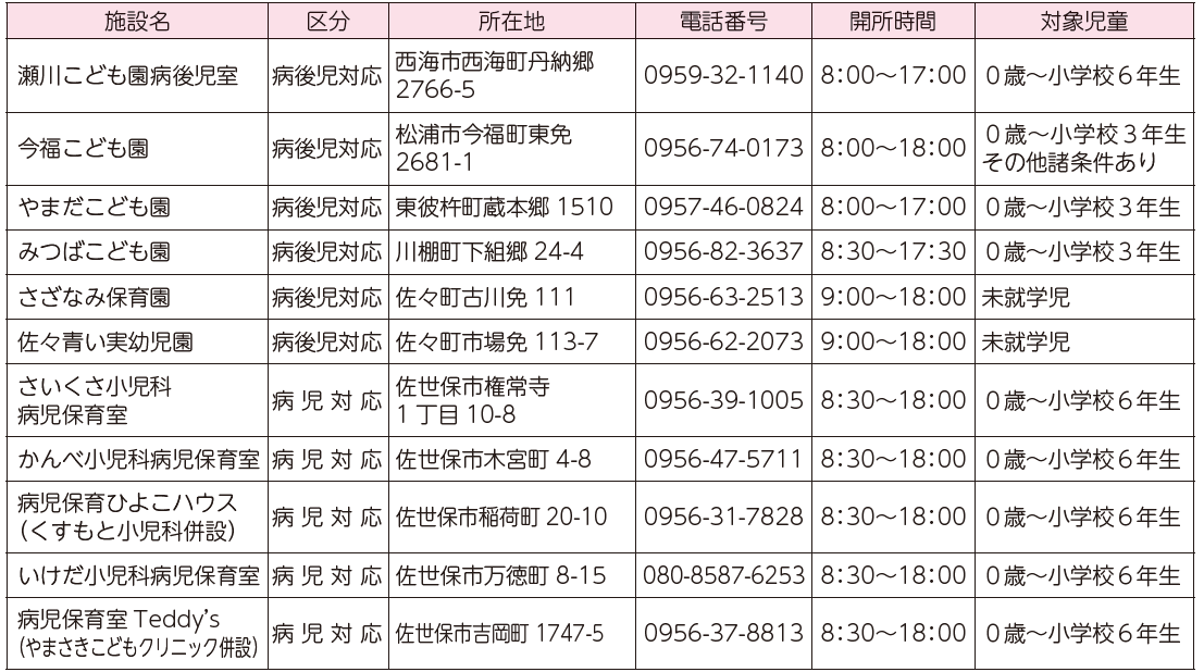 ・令和3年4月から、西九州させぼ広域都市圏内の病児・病後児保育施設の広域利用が可能となり、お近く(市外)の施設が利用できるようになりました