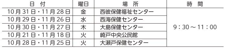 基本的に予約制としていますので、健康ほけん課までご連絡ください。